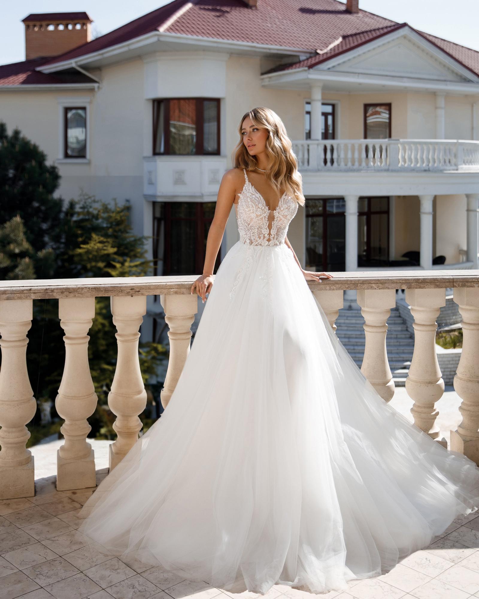 Легка як хмаринка сукня з ніжного єврошовку зі шлейфом. Корсет з глибоким декольте на тонких брительках оздоблений виразним бісерним мереживом, оголена спинка зваблює з першого погляду