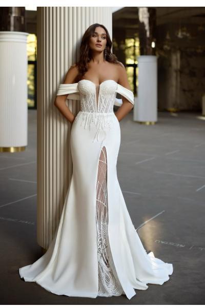 Просто неймовірна та розкішна сукня по фігурі зі шлейфом. Корсет зі спущеними плечиками та вставочка в спідничці з італійського шиття