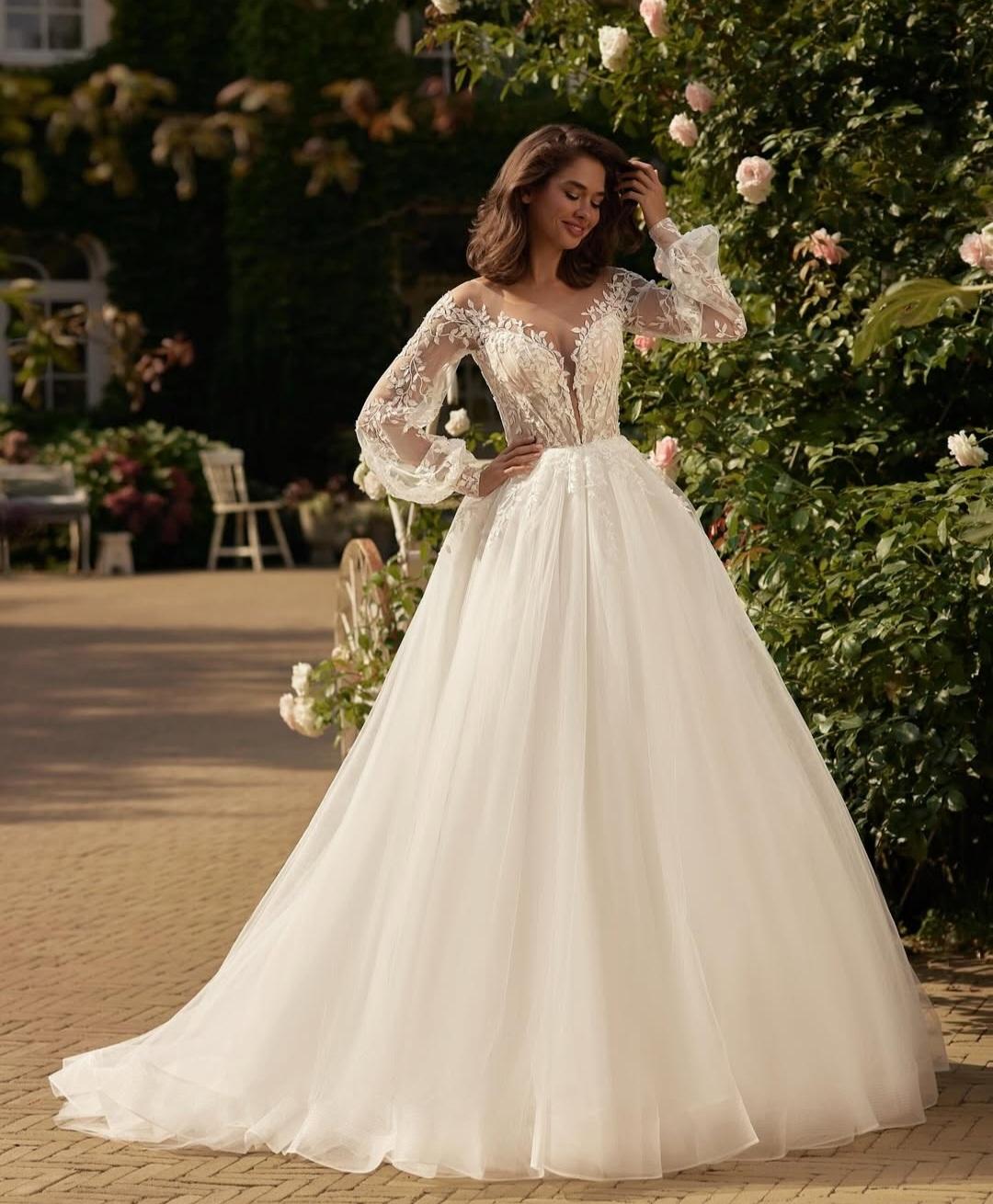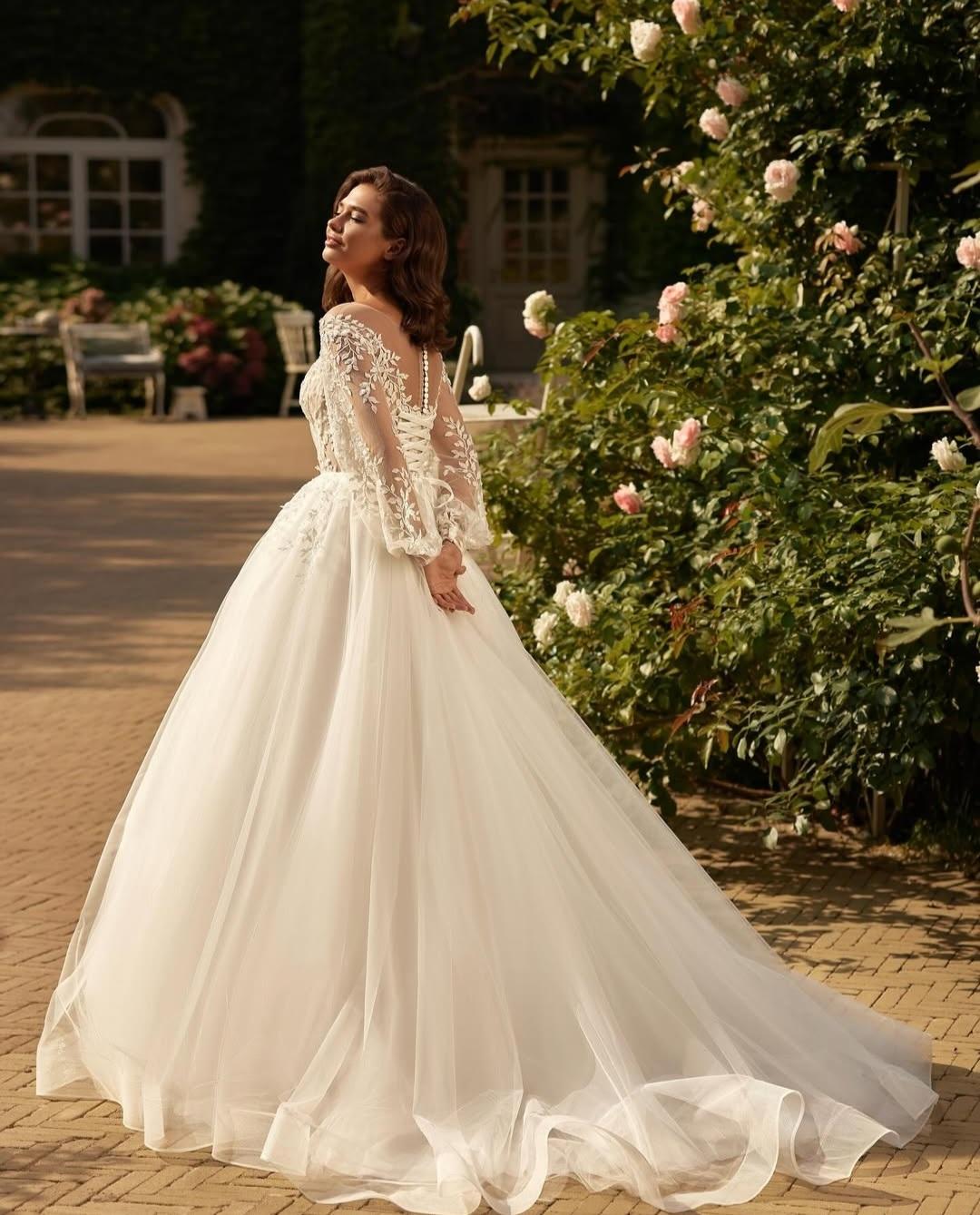 Ніжна та романтична сукня з легкого єврошовку зі шлейфом. Напівпрозорий корсет з глибоким декольте та довгі рукавчики бохо з делікатного італійського шиття.