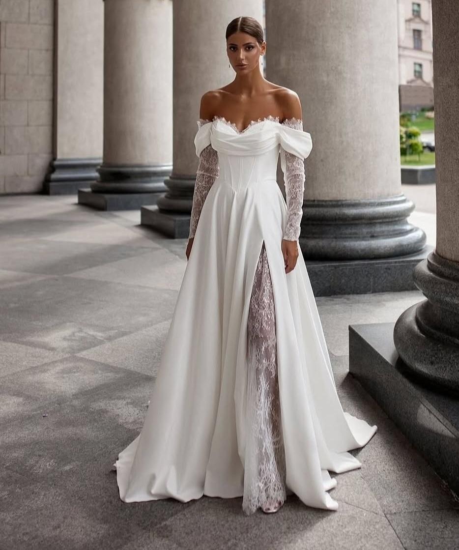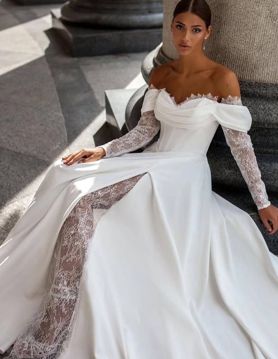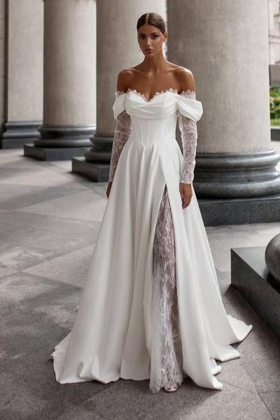 Трендова весільна сукня з легкого атласу з високим завуальованим розрізом. Корсет зі спущеними плечиками має бездоганну посадку. Прямі пукавчики та вставочка в розрізі з делікатного французького шантільї