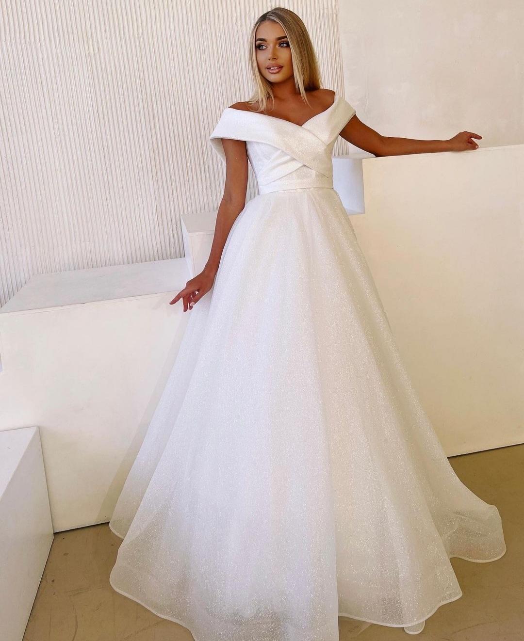 Розкішна весільна сукня з сяючого шимеру. Корсет зі спущеними плечиками має бездоганну посадку і підходить на будь який тип фігури. За бажанням може бути з високим розрізом.