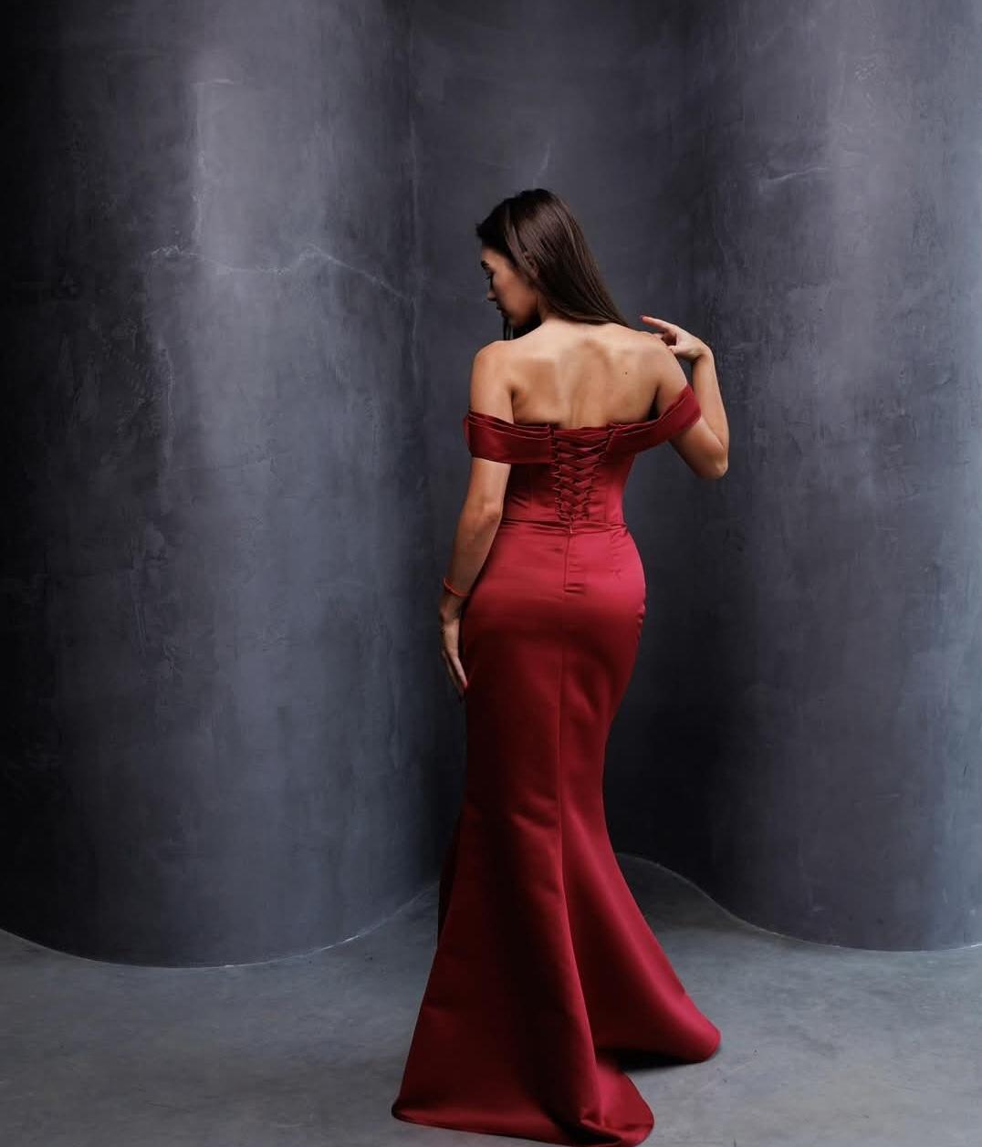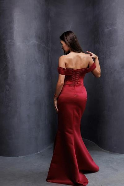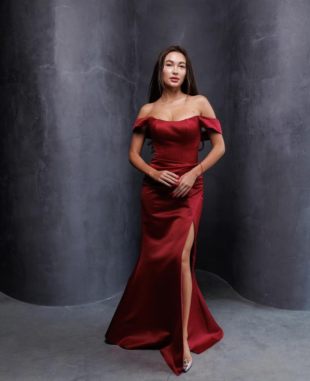Вишукана та елегантна вечірня сукня з королівського атласу має бездоганну посадку по фігурі з високим розрізом на запах.