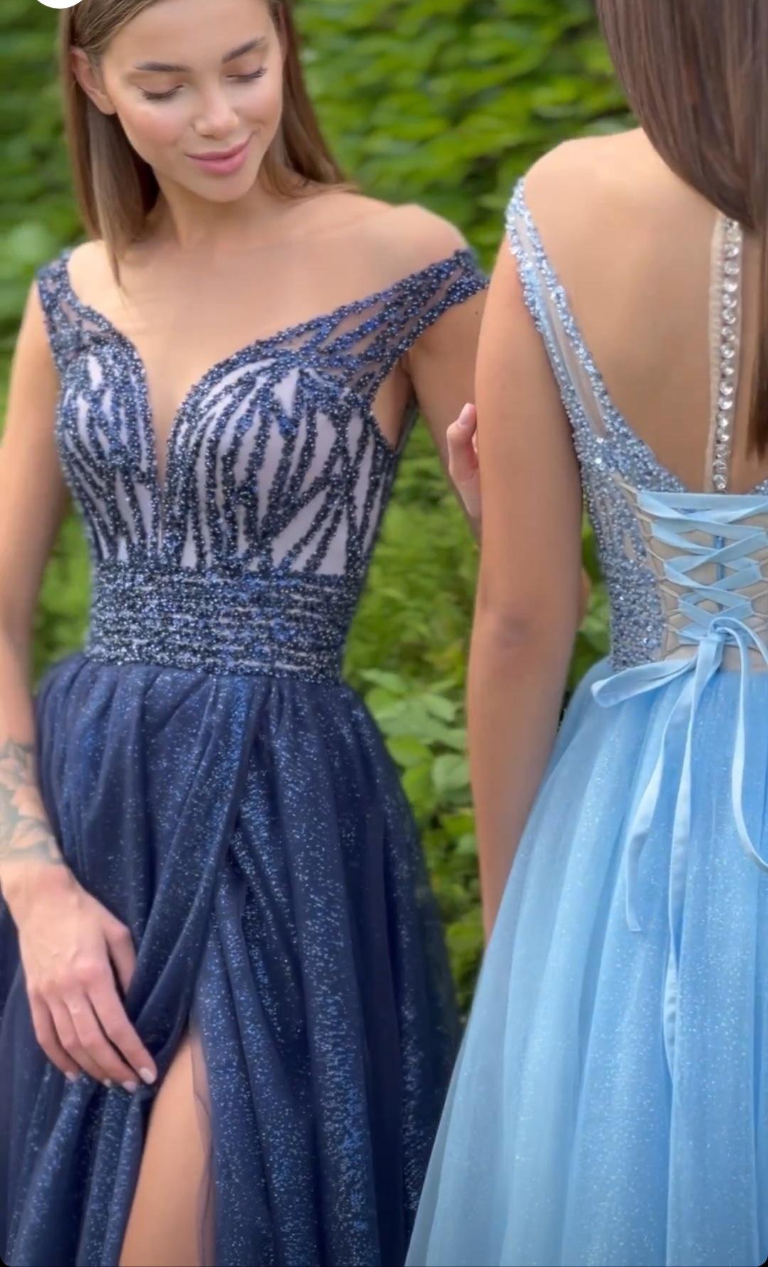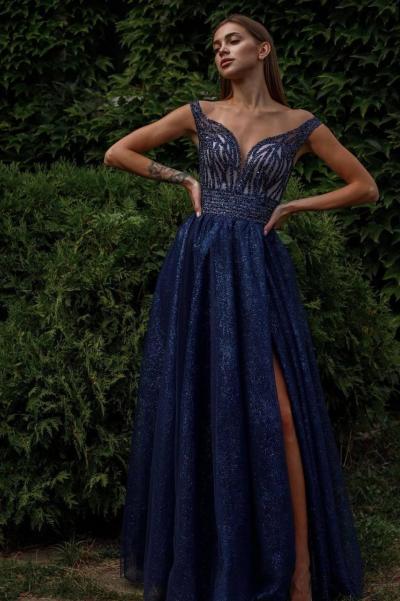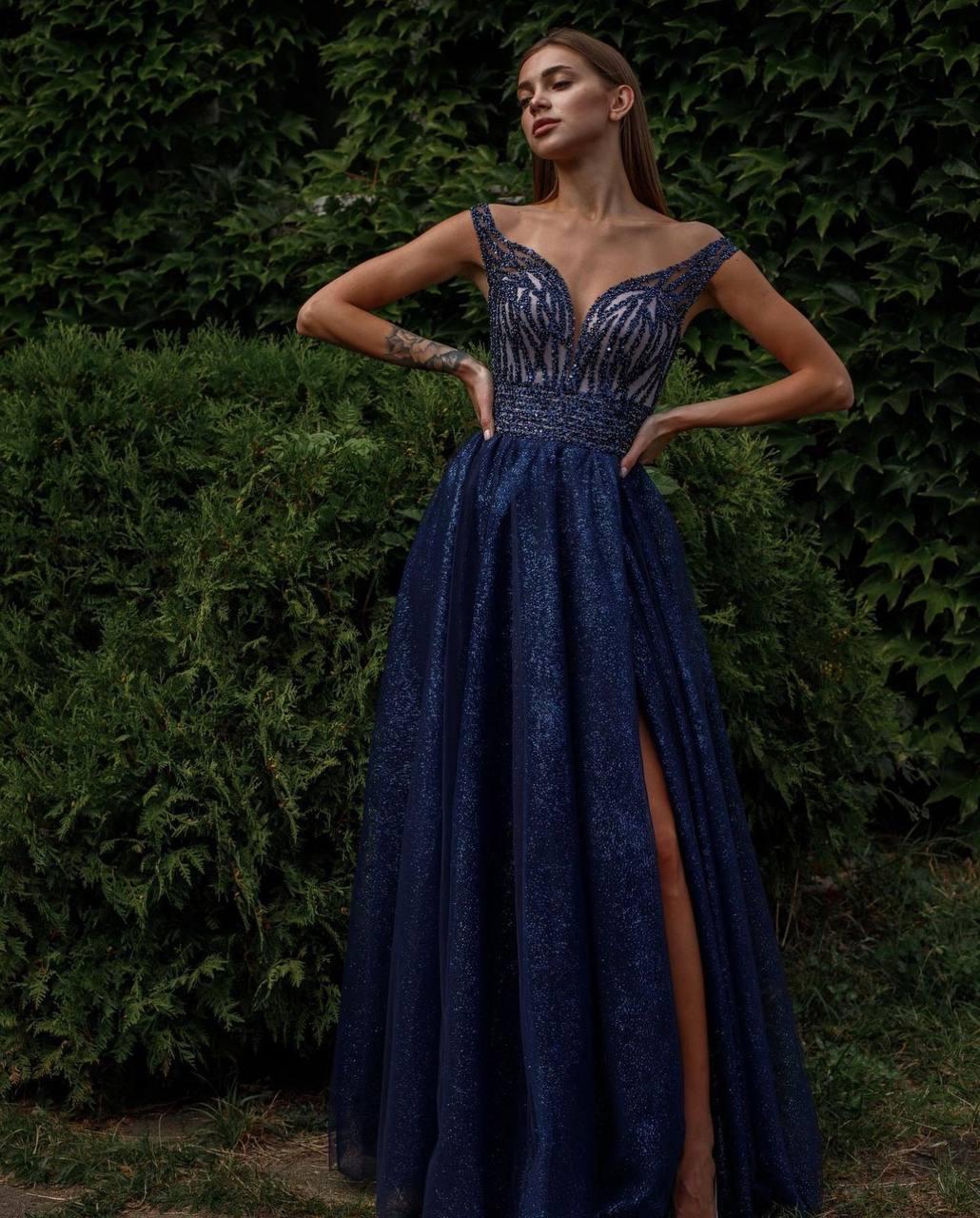 Розкішна вечірня сукня з ніжного єврошовку з легким мерехтінням з високим розрізом на запах. Корсет оздоблений стильним шиттям.