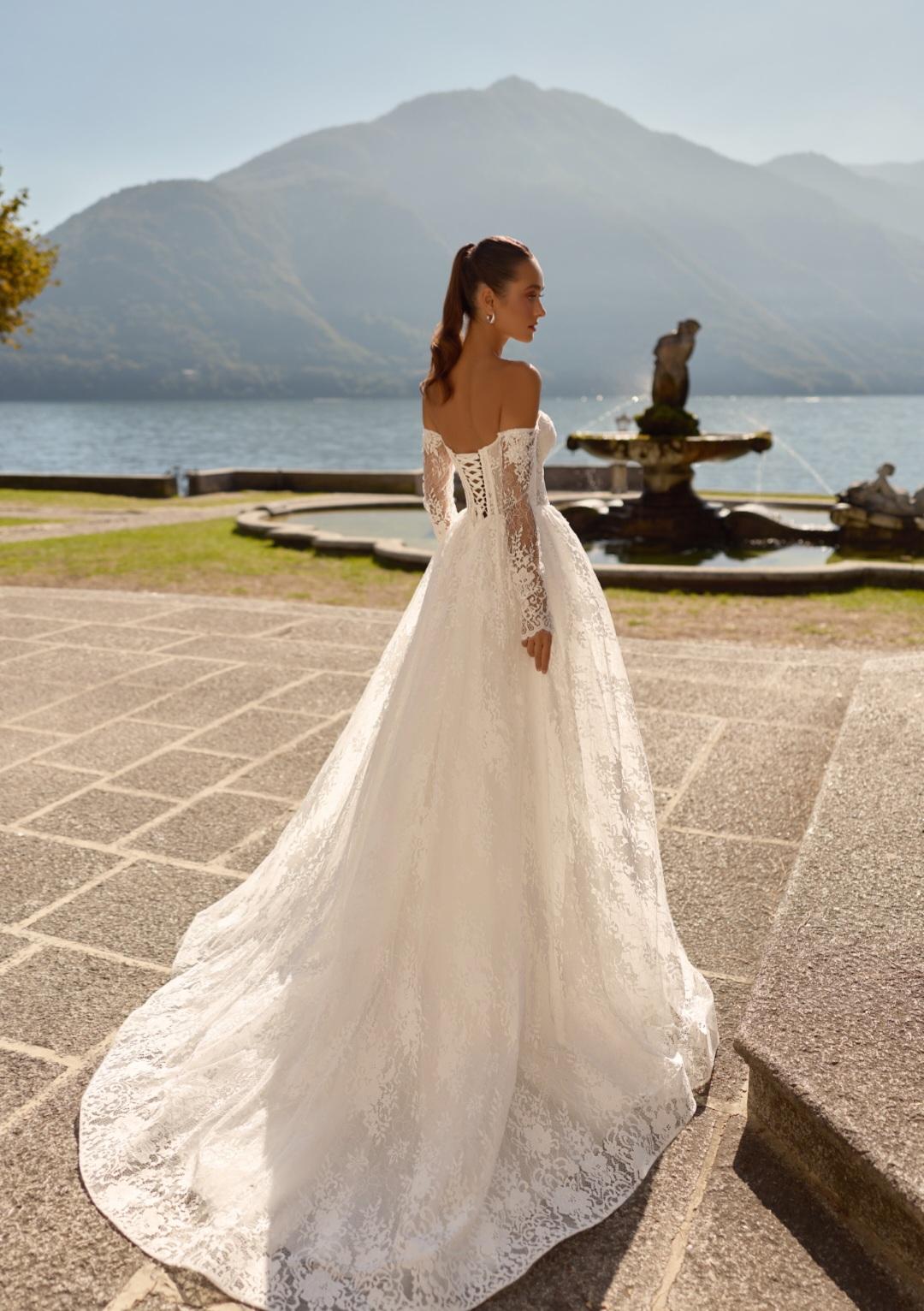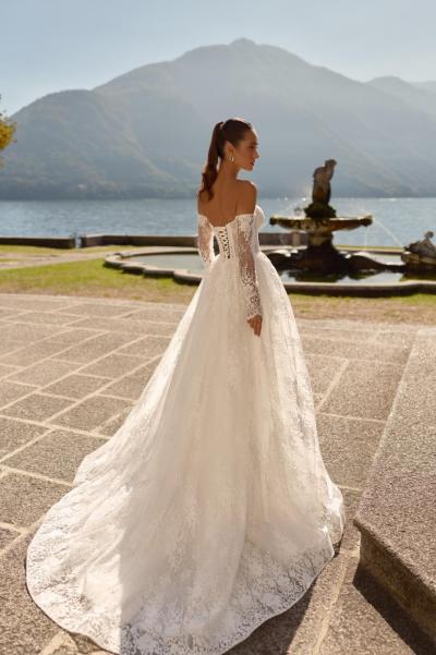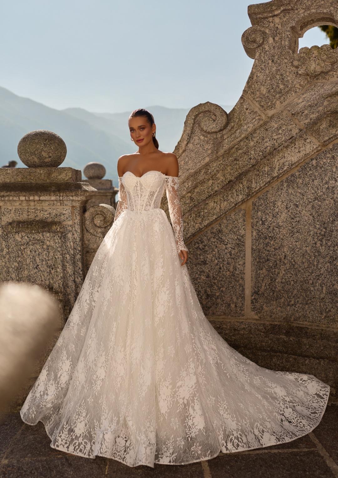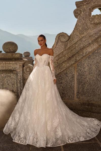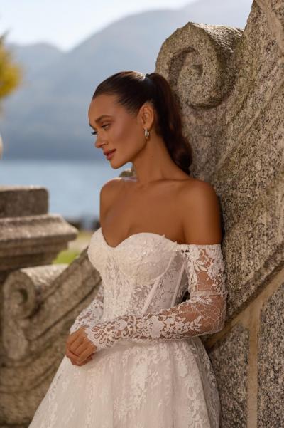 Сукня для справжньої принцеси - справжня перлинка нашої колекції з французького шантіл"ї зі шлейфом та прямими рукавчиками. Корсет в білизняному стилі оздоблений розшитим мереживом.