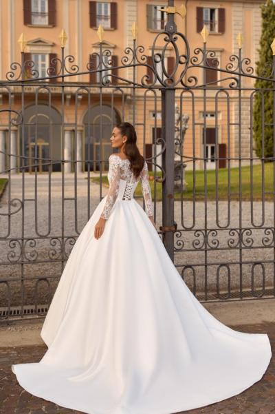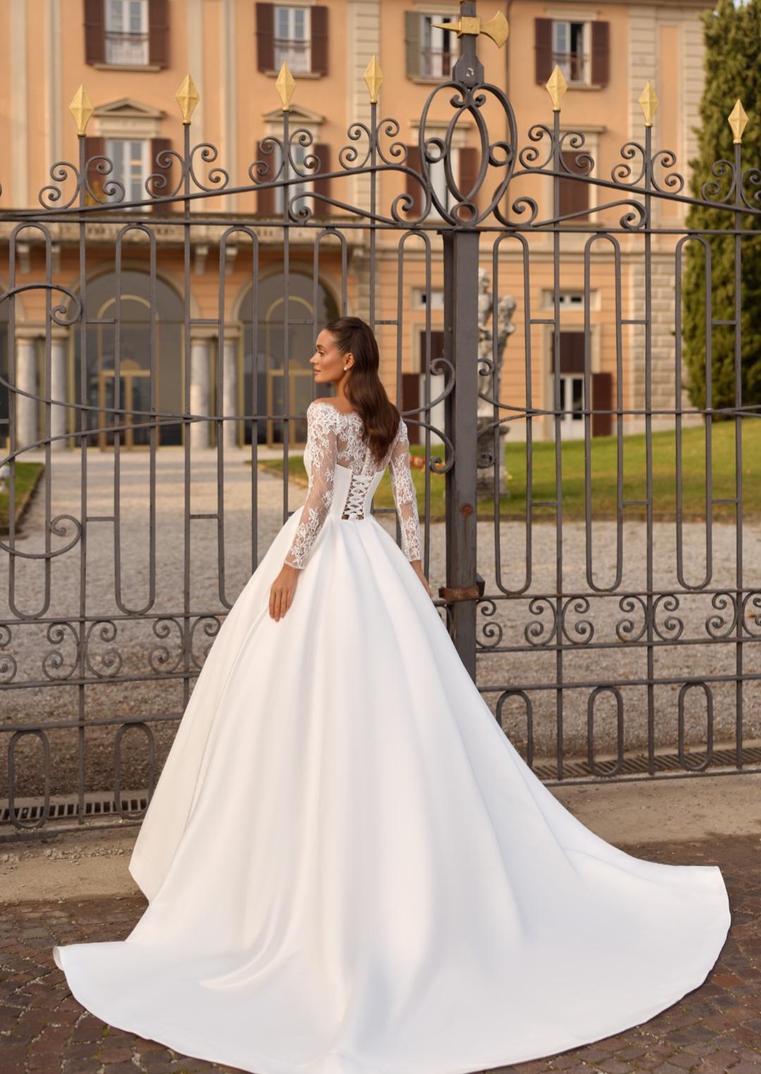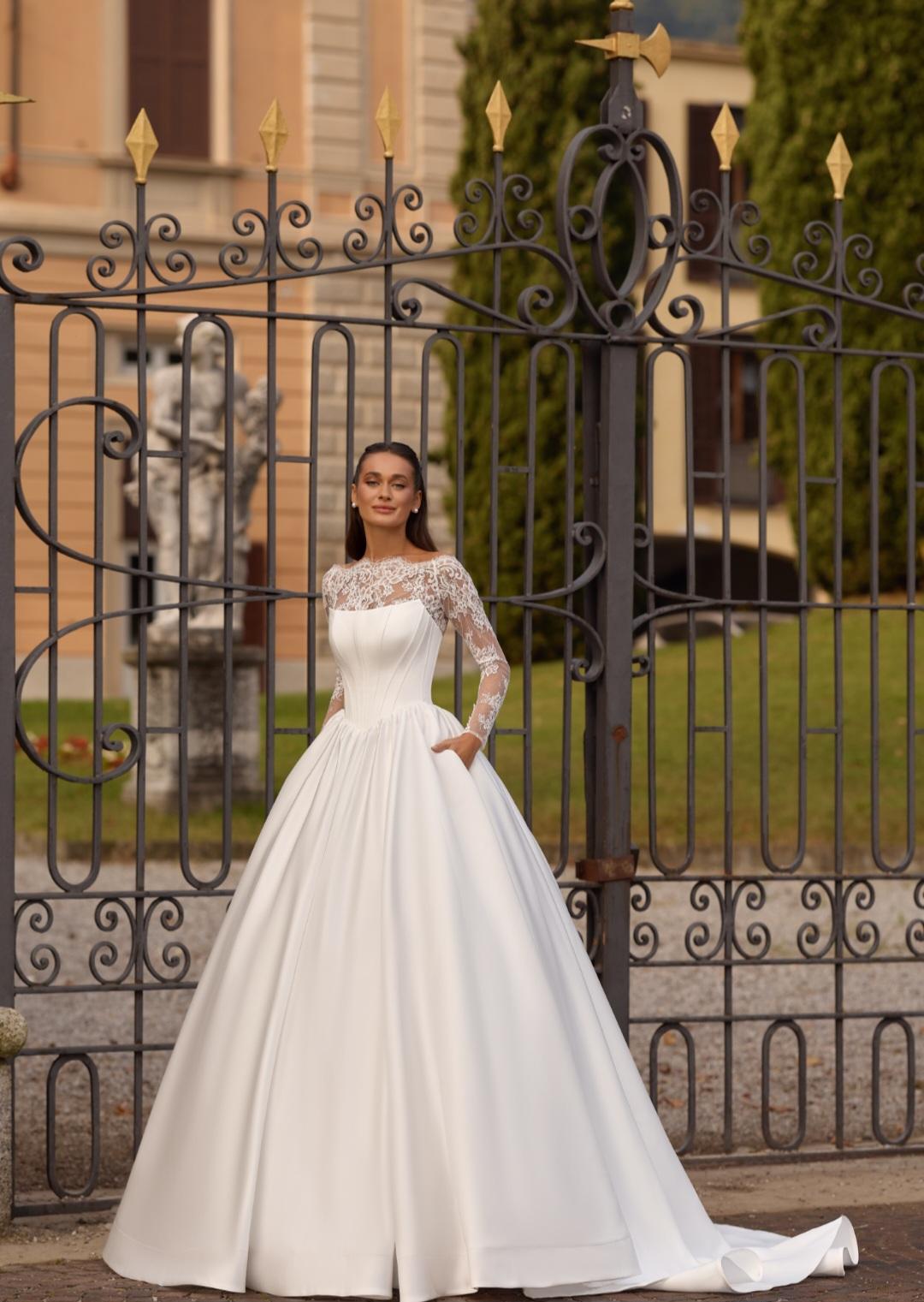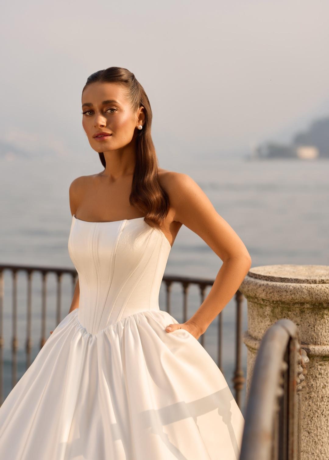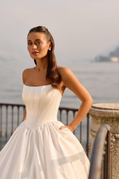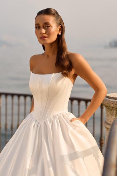 Розкішний мінімалізм. Трендова сукня з королівського атласу з пишною спідницею зі шлейфом. В спідниці є кишені. Корсет з заглибленим низом максимально підкреслює талію. За бажанням до сукні іде  з"мне болеро з французького шантіл"ї. Вартість болєро 6500.