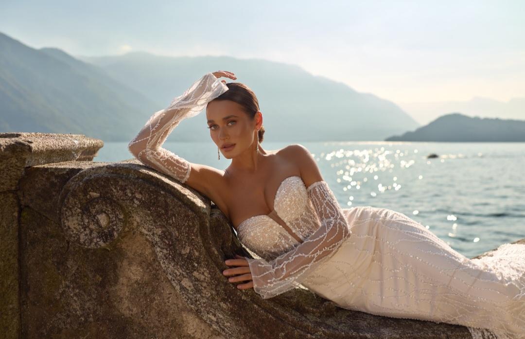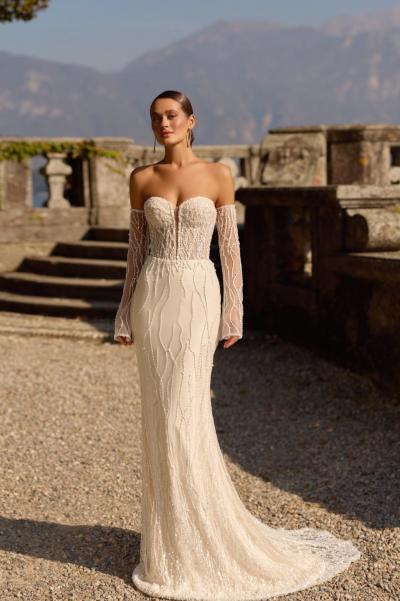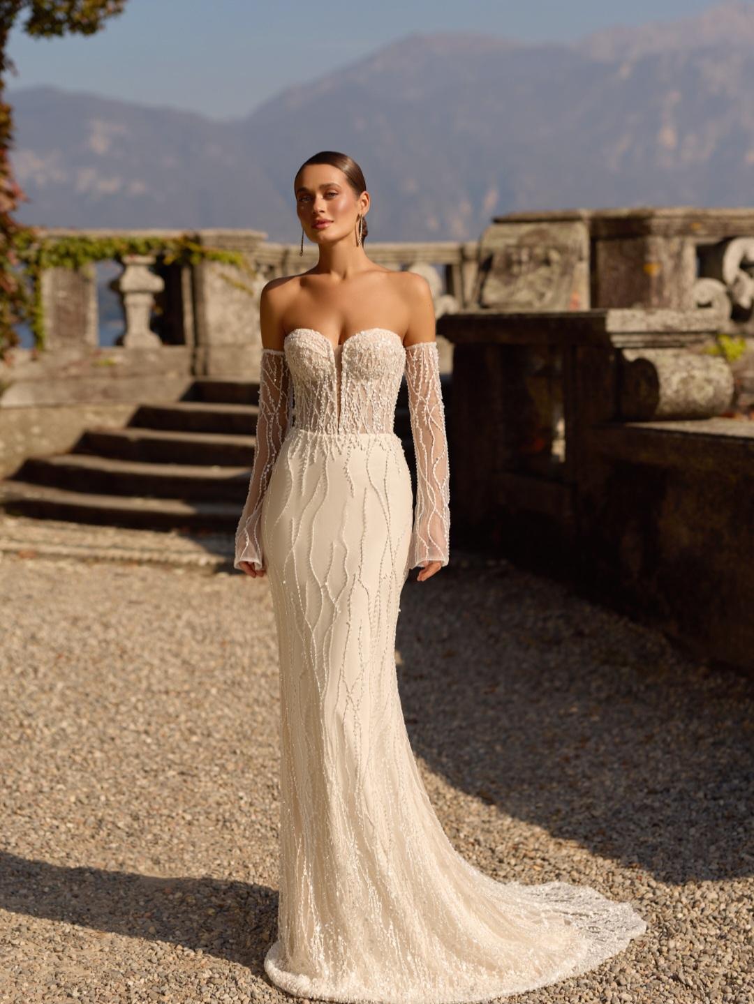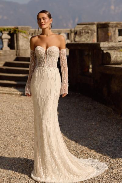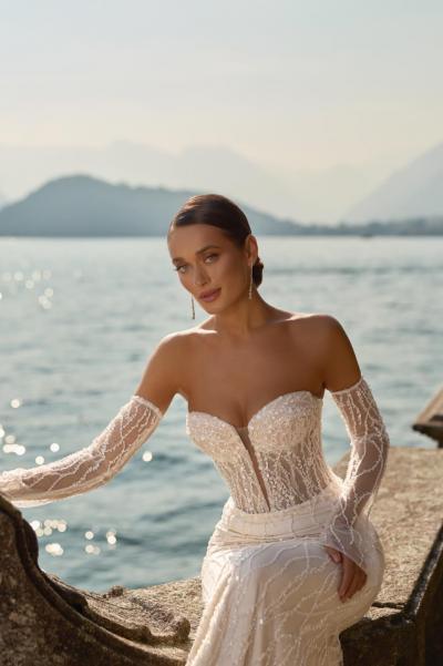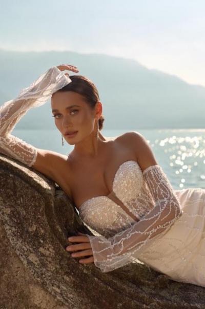 Розкішна весільна сукня з трендового шиття по фігурі зі шлейфом та з"ємними рукавчиками. Напівпрозорий корсет з глибоким декольте оздоблений розшитим мережевом