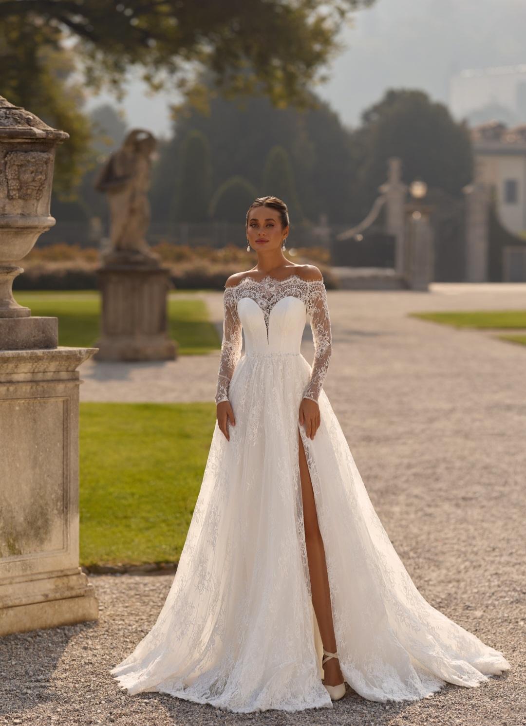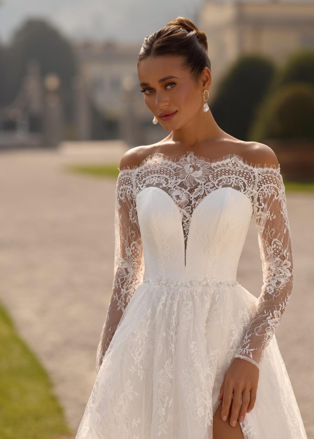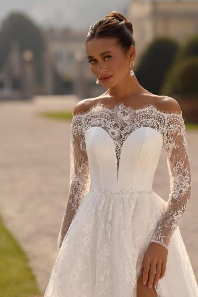 Королівська сукня з трендового французького шантіл"ї зі шлейфом та з високим розрізом. Корсет з глибоким декольте та відкритими плеччиками закохує з першого погляду